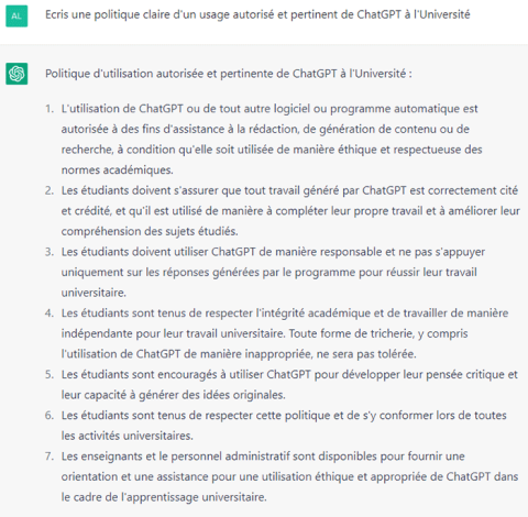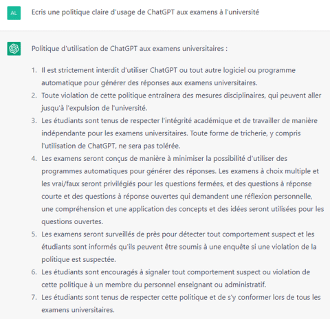 Quand on interroge ChatGPT sur une politique claire (et restrictive) d'usage aux examens universitaires, cela donne ceci :