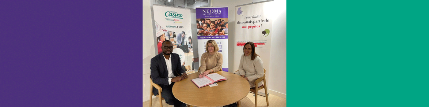 A l’occasion de la Semaine européenne de l’emploi des personnes handicapées de 2024, Monoprix a animé un webinaire sur l’inclusion en entreprise, une manière d’aborder le management de la diversité. Il a été suivi d’un jeu-concours pour les étudiants de NEOMA sponsorisé par l’enseigne. Cette collaboration a débouché en janvier 2025 sur la signature d’un partenariat avec le groupe Casino (qui regroupe Monoprix, Casino, SPAR, Naturalia, Franprix …). Le géant de la distribution s’engage ainsi auprès de l’Ecole à former et accompagner les jeunes talents.