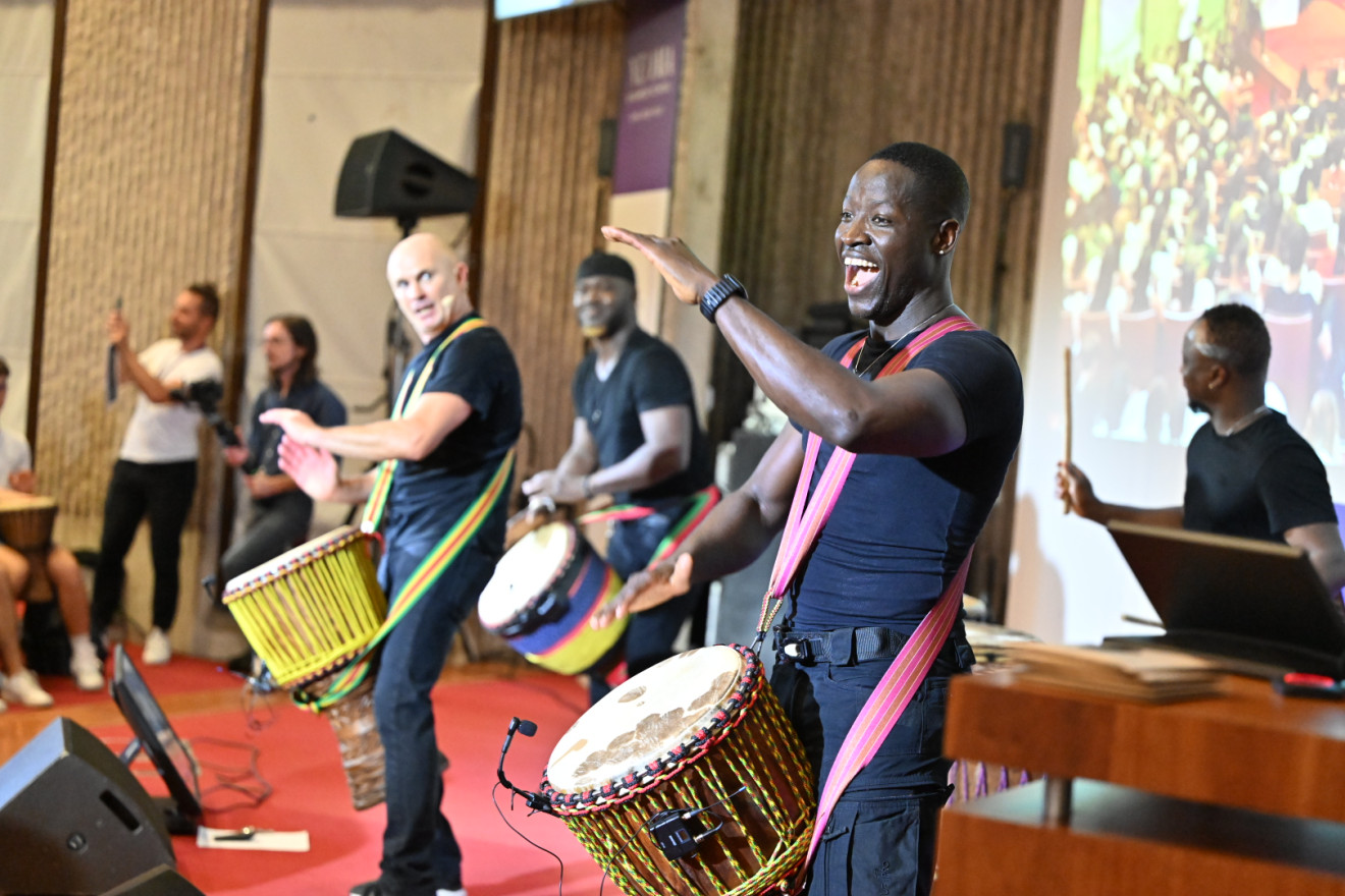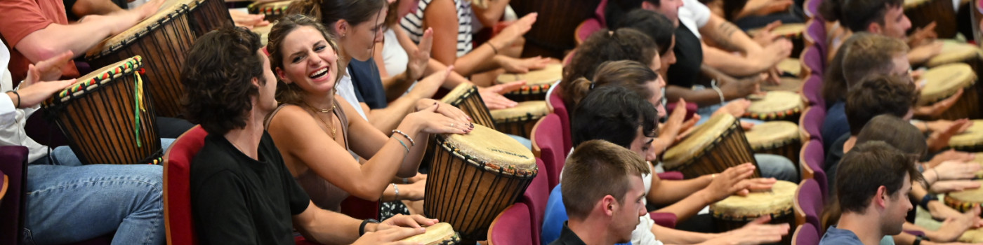 Energie folle dans les amphithéâtres de Reims (le 4 septembre) et de Rouen (le 5 septembre). Pour la rentrée du Programme Grande Ecole de 2023, NEOMA a organisé une session de djembé collective. Sur la scène, quatre musiciens ont entraîné le public à jouer de cet instrument. L’occasion surtout de parler du travail d’équipe, de la place et de la complémentarité de chacun, que ce soit pour jouer dans un groupe comme dans une entreprise, de l’écoute des autres, de l’inclusion, de la raison d’être de chacun…
