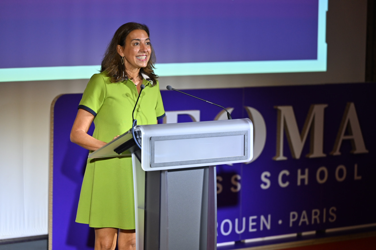 Leur marraine de promotion, Angeles Poveda Garcia, Présidente du conseil d’administration de l'entreprise Legrand, est montée sur scène pour communiquer son énergie positive. Elle a rappelé les défis majeurs actuels, la transition écologique, le saut technologique de l’intelligence artificielle, et l’impératif de sens et de cohésion sociale. Et les trois atouts qu’il faut avoir selon elle pour y faire face : la curiosité, le courage et le cœur. « La curiosité est la marque des grands leaders », a-t-elle indiqué.