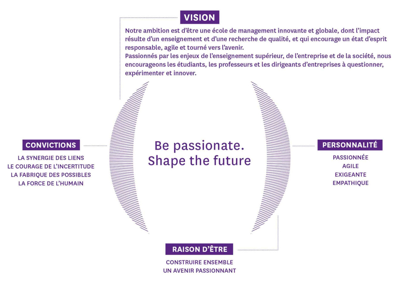 - La fabrique des possibles : Les étudiants d’aujourd’hui sont les architectes du monde de demain. NEOMA Business School leur donne les moyens d’agir sur leur propre futur. En intégrant l’école, ils s’assurent de découvrir et de maitriser leurs compétences, les méthodes et les outils qui leur permettront d’être des acteurs de leurs propres ambitions et de leurs expériences professionnelles. L’aspiration de l’école est d’aider chacun à imaginer puis construire des projets qui lui correspondent et à réaliser ses aspirations. Notre valeur associée : l’excellence